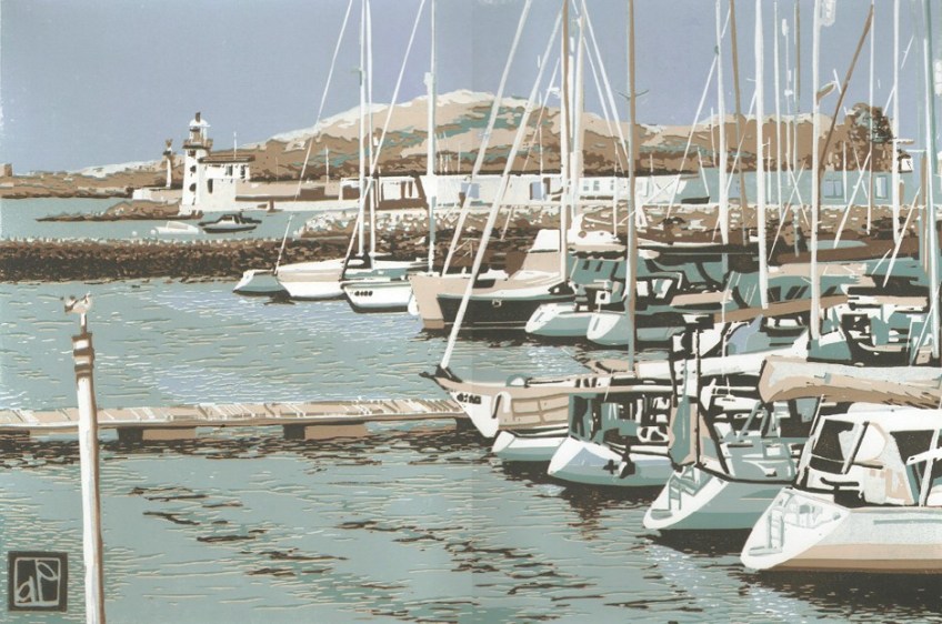 A reduction lino print of Howth Harbour, Co.Dublin, Ireland, with the lighthouse and Ireland’s Eye (a small island just off the coast) in the background.