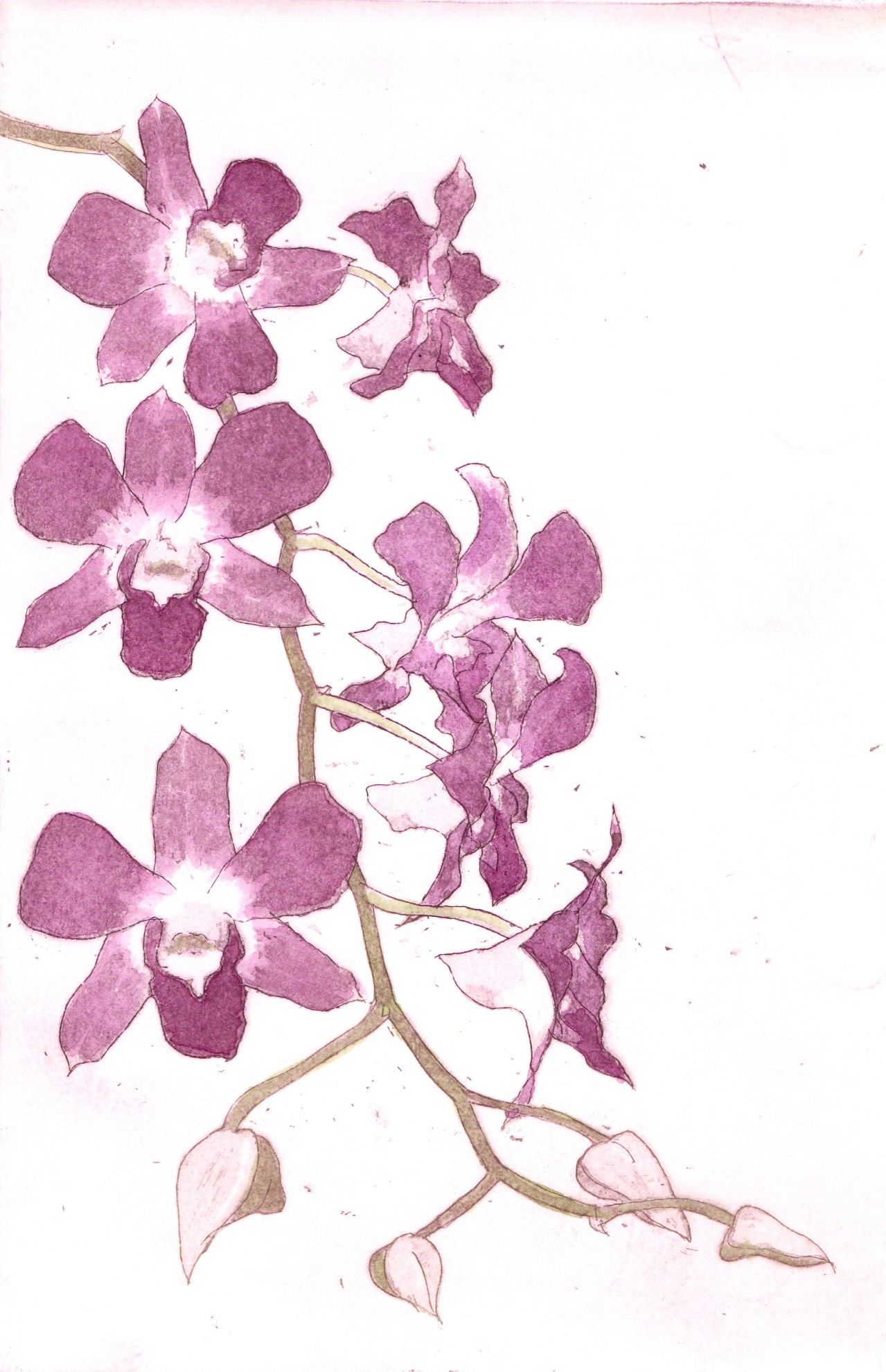An original copper plate intaglio print of a Dendrobium Sonia Orchid stem, with hard ground etching and aquatint.
