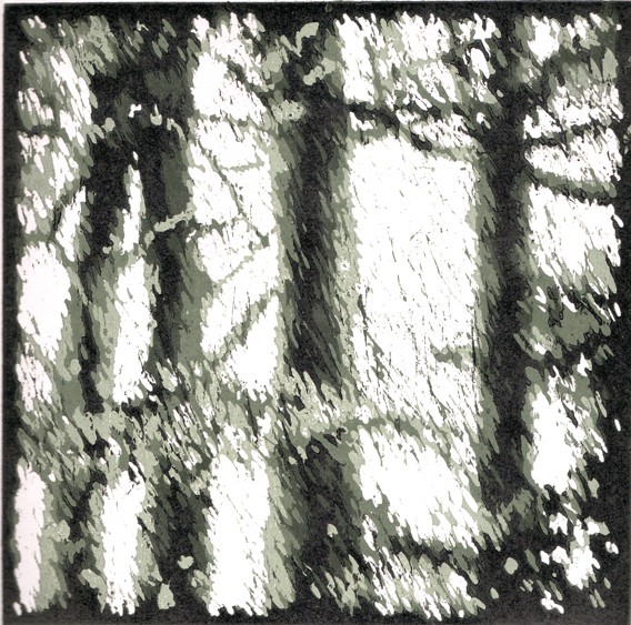 An original reduction woodblock print of sunlight filtering through some big old trees.