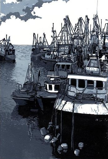 An original reduction lino print of boats in the harbor at Kilmore Quay, Ireland.