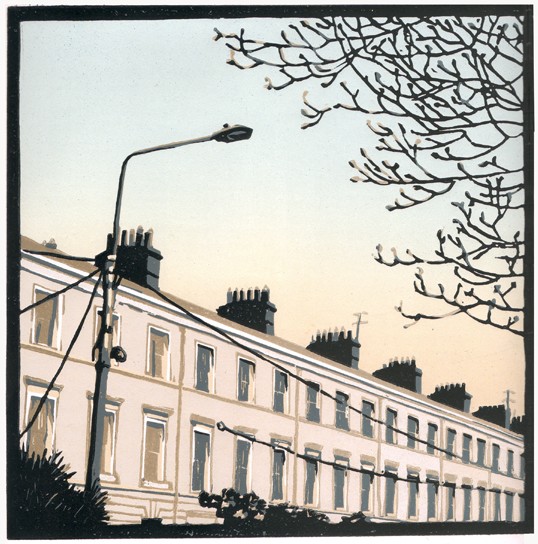 An original reduction linocut print of the terraced houses along Longford Terrace, Monkstown (Dun Laoghaire), Dublin.